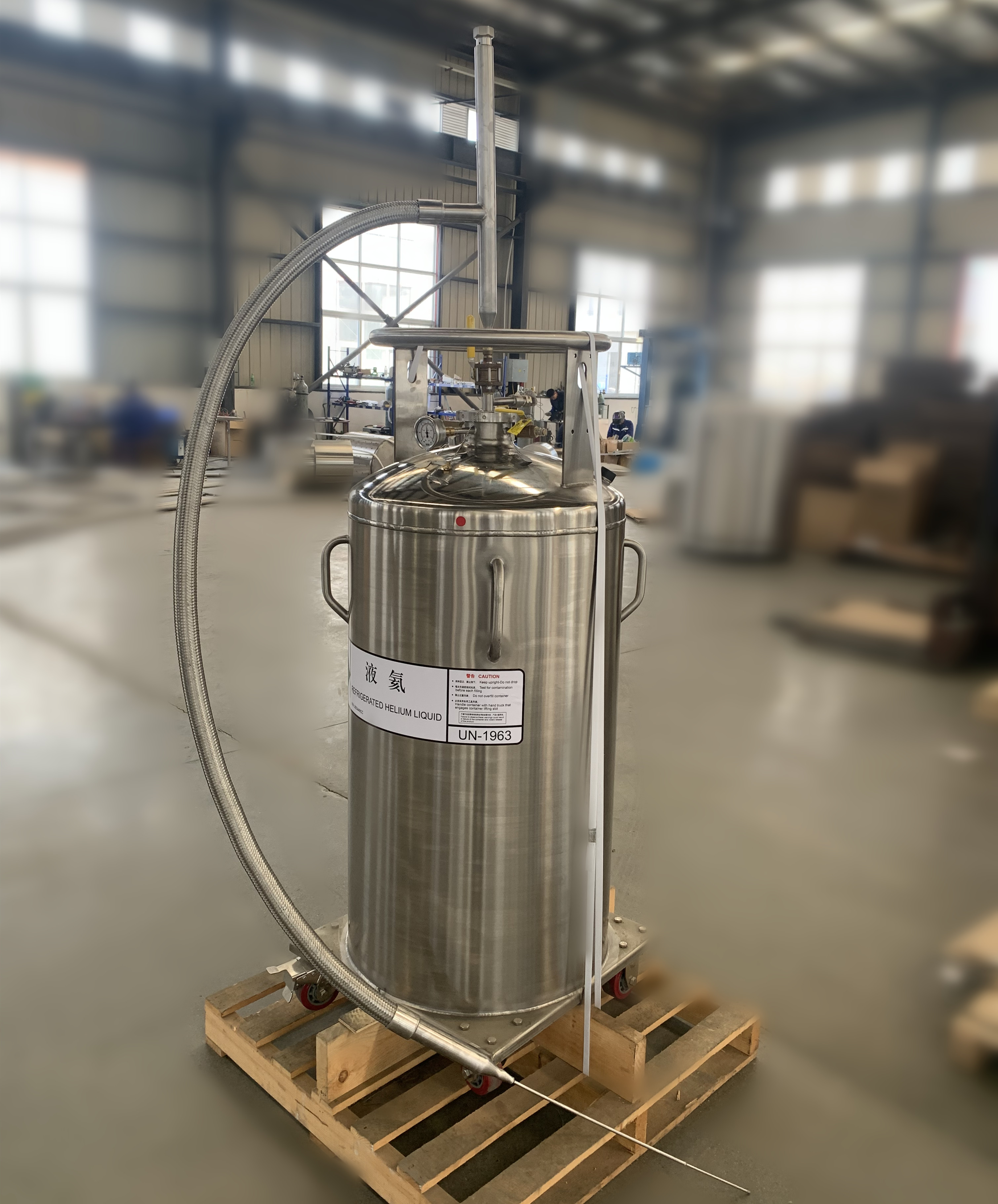 主要用來(lái)從大型液氦杜瓦瓶傳輸液氦至小型液氦杜瓦瓶,或者從用液氦杜瓦瓶為核磁做補(bǔ)液使用。根據(jù)客戶具體用途定制柔性管路和硬管具體長(zhǎng)度。